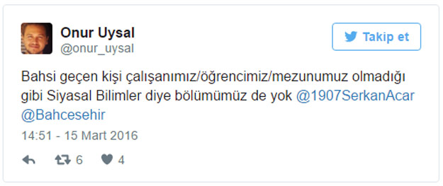 Ayşe Hümeyra Okur'un profil bilgilerinde yer alan Bahçeşehir Üniversitesi siyasal bilimlerde olduğu bilgileri okul tarafından yalanlandı. Bahçeşehir Üniversitesi Medya Direktörü Onur Uysal Twitter'dan "Bahsi geçen kişi çalışanımız/öğrencimiz/mezunumuz olmadığı gibi Siyasal Bilimler diye bölümümüz de yok" ifadelerinin yer aldığı açıklama yaptı.