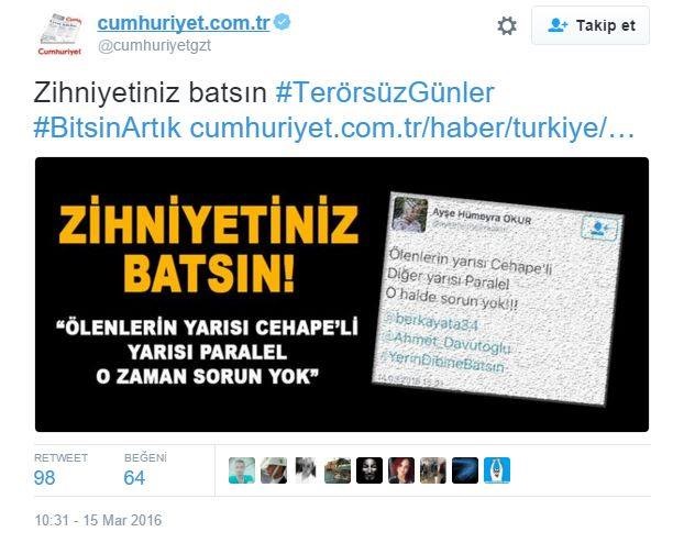Cumhuriyet gazetesi Ankara saldırısıyla ilgili tepki çeken bir habere daha imza attı. Sahte hesaptan atılan bir tweet üzerinden haber yapan gazete başörtülü kadınları adeta hedef gösterdi.