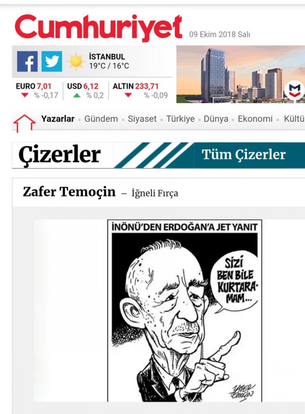 Yayımlanan karikatürde, “İsmet İnönü’den Erdoğan’a jet yanıt” ifadeleri kullanılarak, İnönü’nün, “Sizi ben bile kurtaramam” sözüne yer verildi.