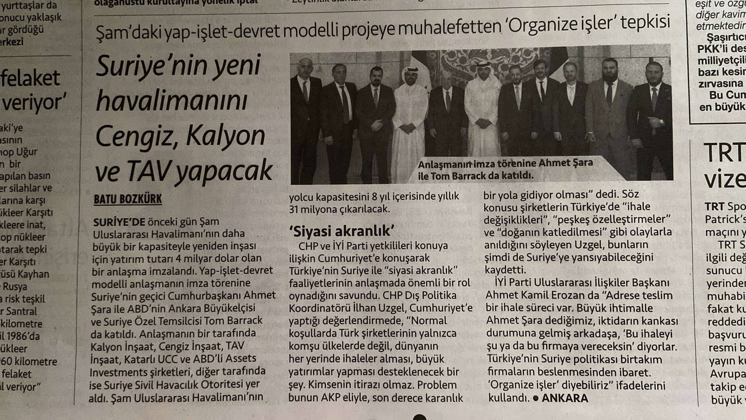 Cumhuriyet gazetesi, Türk iş adamlarının Suriye'de yapacağı yeni havalimanı projesine ilişkin yayımladığı haberde “organize işler” ifadesini kullanarak büyük bir skandala imza attı. Şam’daki yap-işlet-devret modeliyle hayata geçirilecek havalimanı yatırımına büyük Türk firmaları öncülük etti. Ancak istemezükçü gazetenin projeye yönelik karalama kampanyası, okuyanların ağzını açık bıraktı.