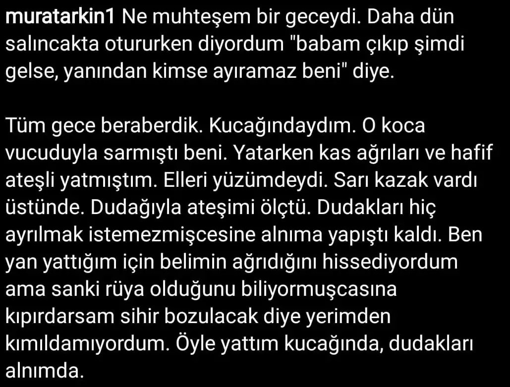 "Ne muhteşem bir geceydi. Daha dün salıncakta otururken diyordum 'babam çıkıp şimdi gelse, yanından kimse ayıramaz beni' diye. Tüm gece beraberdik. Kucağındaydım. O koca vücuduyla sarmıştı beni. Yatarken kas ağrıları ve hafif ateşli yatmıştım. Elleri yüzümdeydi. Sarı kazak vardı üstünde. Dudağıyla ateşimi ölçtü. Dudakları hiç ayrılmak istemezmişçesine alnıma yapıştı kaldı. Ben yan yattığım için belimin ağrıdığını hissediyordum, ama sanki rüya olduğunu biliyormuşçasına kıpırdarsam sihir bozulacak diye yerimden kımıldamıyordum. Öyle yattım kucağında, dudakları alnımda."