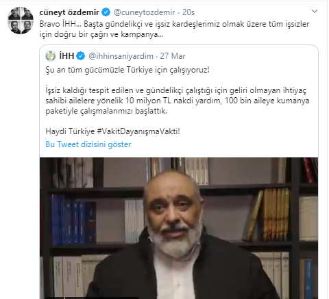 Cüneyt Özdemir, paylaşımında "Bravo İHH... Başta gündelikçi ve işsiz kardeşlerimiz olmak üzere tüm işsizler için doğru bir çağrı ve kampanya..." ifadelerini kullandı.