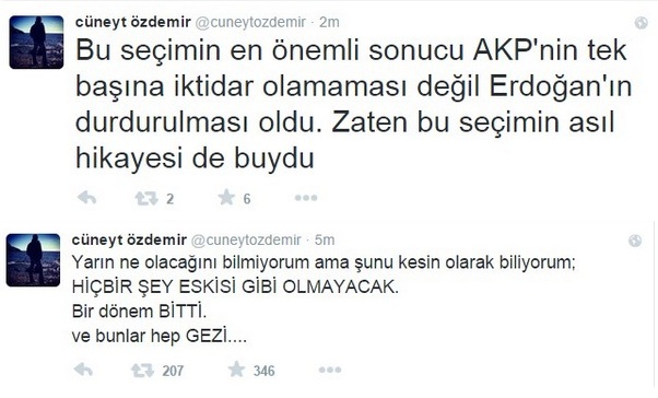 Özdemir, "Yarın ne olacağını bilmiyorum ama şunu kesin olarak biliyorum; hiçbir şey eskisi gibi olmayacak. Bir dönem bitti ve bunlar hep Gezi" ifadelerini kullandı.