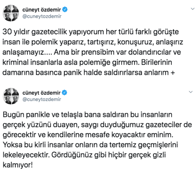 "30 yıldır gazetecilik yapıyorum her türlü farklı görüşte insan ile polemik yaparız, tartışırız, konuşuruz, anlaşırız anlaşamayız.... Ama bir prensibim var dolandırıcılar ve kriminal insanlarla asla polemiğe girmem. Birilerinin damarına basınca panik halde saldırırlarsa anlarım.