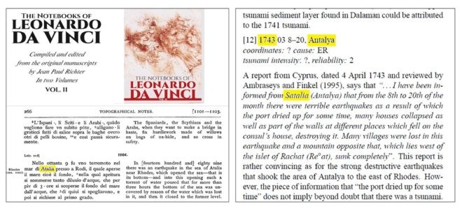Tarihte ünlü kişilerin günlüklerinde önemli olaylara ilişkin notların yer aldığını kaydeden Prof. Dr. Dipova, “Leonardo da Vinci, Osmanlı’ya karşı Memlükler döneminde savunma yapıları yaptırılması için buraya getirilmiş. Günlüğünde Antalya’da büyük bir deprem olduğu ve denizin çekilerek dipteki yarığın görüldüğü, bu işlemin 3 saat kadar sürdüğü yazıyor. Buradan bir tsunami anlaşılabilir. Kıbrıs’ta da bir not kaydedilmiş. Antalya’da korkunç bir depremin olduğu bir ticari belgede kaydedilmiş. Suyun çekildiği anlatılmış. Patara’da deniz fenerinin yine bir tsunami sonucu yıkıldığı uzmanlar tarafından öne sürülüyor” ifadelerini kullandı.