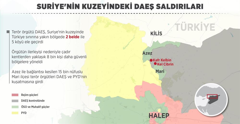 Terör örgütü DAEŞ, Suriye'nin kuzeyinde Türkiye sınırına yakın bölgede 2 belde ile 5 köyü ele geçirdi. Söz konusu bölgeler çevresinde çatışmalar devam ederken, beldelerin düşmesi nedeniyle muhaliflerin kontrolündeki Azez ile güneyindeki Mari ilçelerinin bağlantısı kesildi.