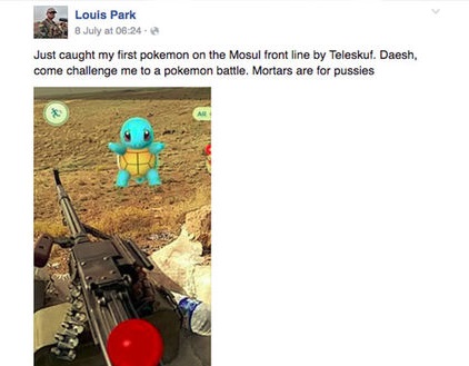 Irak'ta Peşmerge'yle birlikte DAEŞ'e karşı savaşan ABD'li asker Louis Park'ın Facebook'tan Pokemon Go oynarken paylaştığı fotoğraf sosyal medyayı salladı.