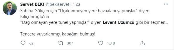 Binlerce sosyal medya kullanıcısı, “Sabiha Gökçen için "Uçak inmeyen yere havaalanı yapmışlar" diyen Kılıçdaroğlu'na "Dağ olmayan yere tünel yapmışlar" diyen Levent Üzümcü gibi bir seçmen... Tencere yuvarlanmış, kapağını bulmuş!”, “Leven Üzümcü’nün beynini Katarlılara satmaya çalışmışlar, parayı verip malı alamayan Katarlılar olay çıkartmış. :/”, “Levent Üzümcü’yü gören hiçbir muhalif,çocuğunun notları düşük diye üzülmesin. Hiçbir şey olamazsa muhalefet partilerinden birinde siyasetçi olur. Yükselmek için zeka varlığı değil ahlak yokluğu aranıyor zira”, “Dağdaki çobanla Levent Üzümcü'nün oyu bir mi şimdi?” şeklinde yaptıkları paylaşımlarla üzümcü ile dalga geçti.