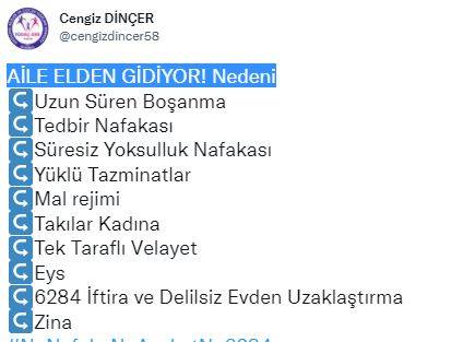 Resmi sosyal medya hesabından paylaşımda bulunan Dağılmış Aileler ve Çocuk Hakları Derneği Başkanı Cengiz Dinçer, “Uzun Süren Boşanma, Tedbir Nafakası, Süresiz Yoksulluk Nafakası, Yüklü Tazminatlar, Mal rejimi, Takılar Kadına, Tek Taraflı Velayet, 6284 İftira ve Delilsiz Evden Uzaklaştırma, Zina” maddeleri ile ailenin elden gittiğini söyledi.