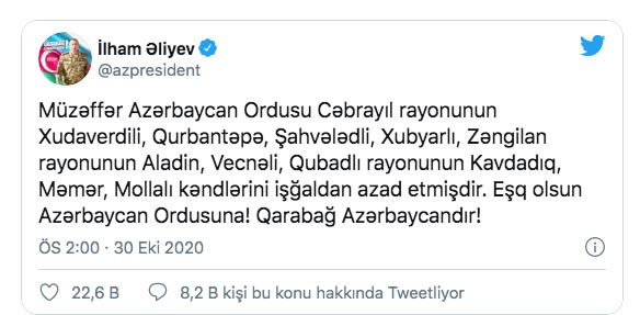 Azerbaycan Dağlık Karabağ’ı geri aldı mı? Azerbaycan ordusu Dağlık Karabağ’a girdi mi? Azerbaycan Cumhurbaşkanı Aliyev, 9 köyün daha Ermenistan işgalinden kurtarıldığını açıkladı. Azerbaycan ordusu, Hudaverdili, Gurbantepe, Şahveledli, Hubyarlı, Aladin, Vecneli, Kavdadıg, Memer ve Mollalı köylerini Ermenistan'dan geri aldı. Azerbaycan Cumhurbaşkanı İlham Aliyev, işgalden kurtarılan yerleri sosyal medya hesabından duyurdu