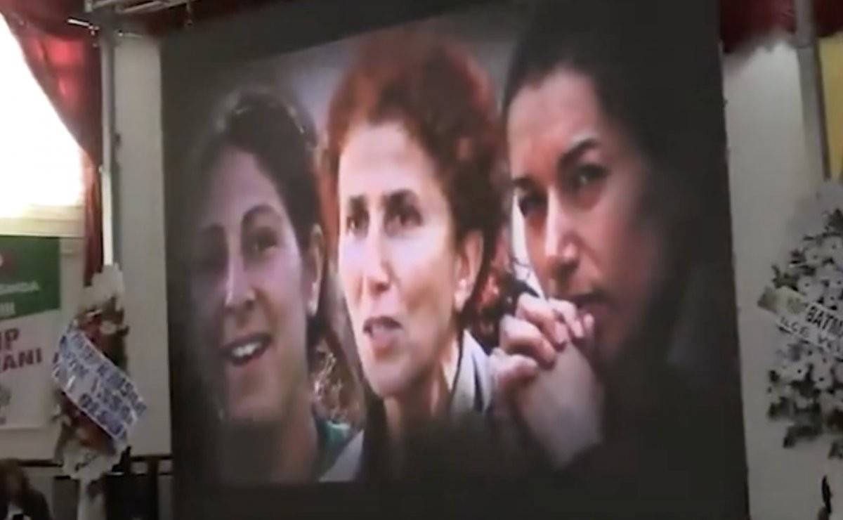 Görüntülerde bebek katili Abdullah Öcalan'ın posteri ve çeşitli eylemlere katılmış teröristlerin resimleri yer aldı. Resimler ekrana verilirken "Biji Serok Apo" diye slogan atıldı ve alkışlandı.