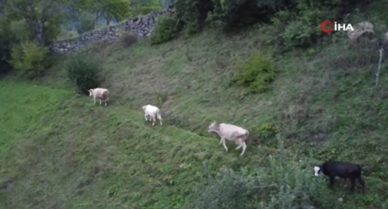 Artvin Şavşat Meydancık köyünde yaşayan içerik üreticisi Onur Ekin, ineklerini dronla ahıra getiriyor.