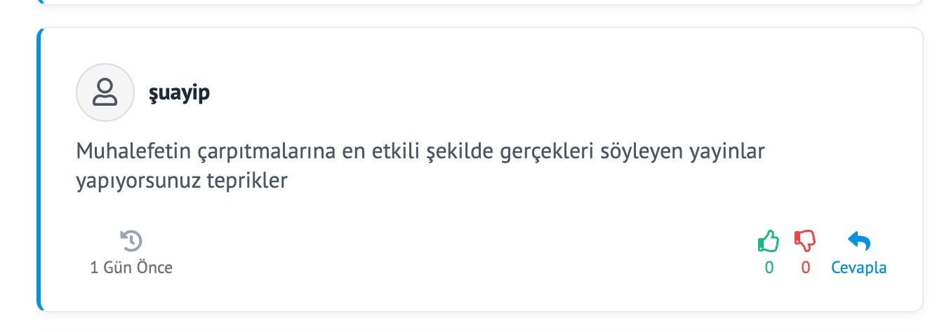 * Şuayip (isimli okuyucu): “Muhalefetin çarpıtmalarına en etkili şekilde gerçekleri söyleyen yayınlar yapıyorsunuz. Tebrikler.
