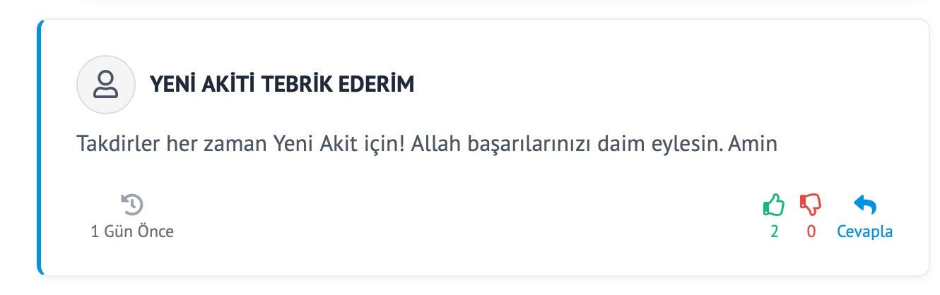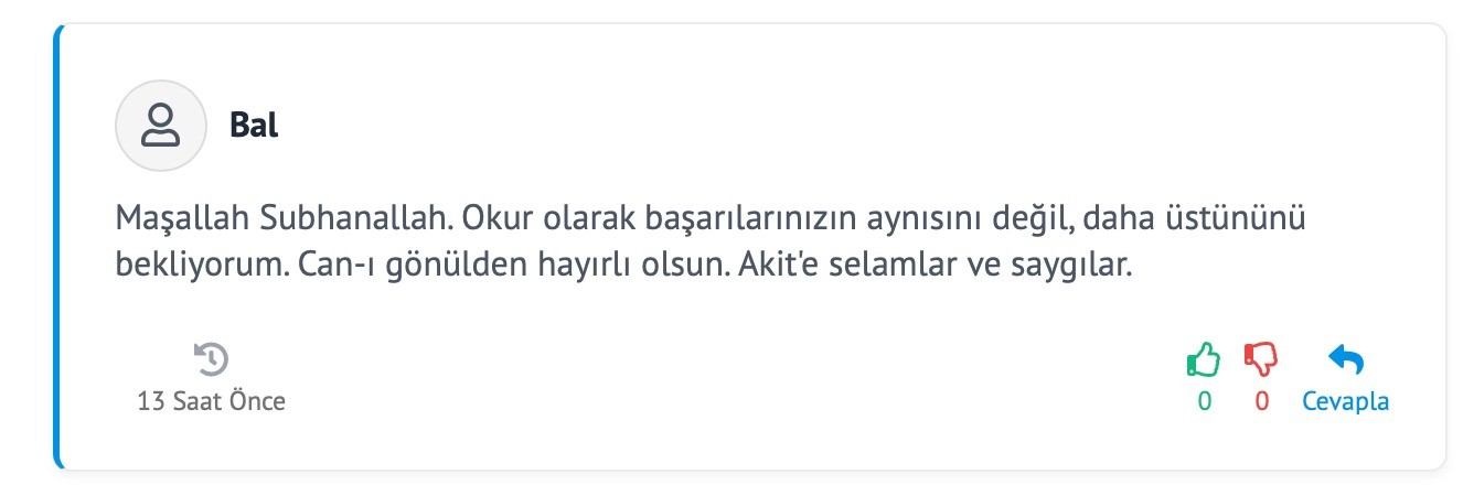 * Bal (rumuzlu kullanıcı): “Maşallah Subhanallah. Okur olarak başarılarınızın aynısını değil, daha üstününü bekliyorum. Can-ı gönülden hayırlı olsun. Akit'e selamlar ve saygılar.”