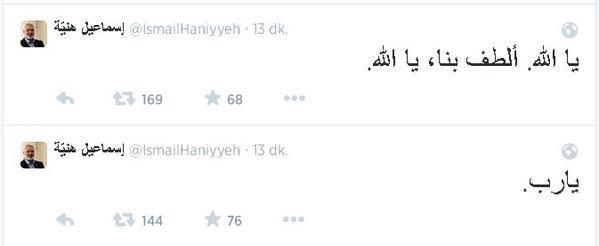 "An itibari ile Gazze üzerinde İHA ve Savaş Uçakları uçuşlarını sürdürüyor. Yer yer helikopter uçuşlarıda mevcut. HAMAS şuanda olası bir savaşa karşı tüm hazırlıkları yapıyor. Kırmızı alarm durumuna geçilmiş durumda. Gazzeli kardeşlerimiz Türkiyeli kardeşlerinden özellikle yoğun bir şekilde dua istiyorlar. Lütfen dualarımızda Gazze'li mücahitleri unutmayalım."