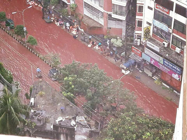 Bangladeş'in başkentinde yağan yağmur kesilen kurbanların kanıyla birleşince Dakka sokaklarında kıpkırmızı nehirler oluştu.