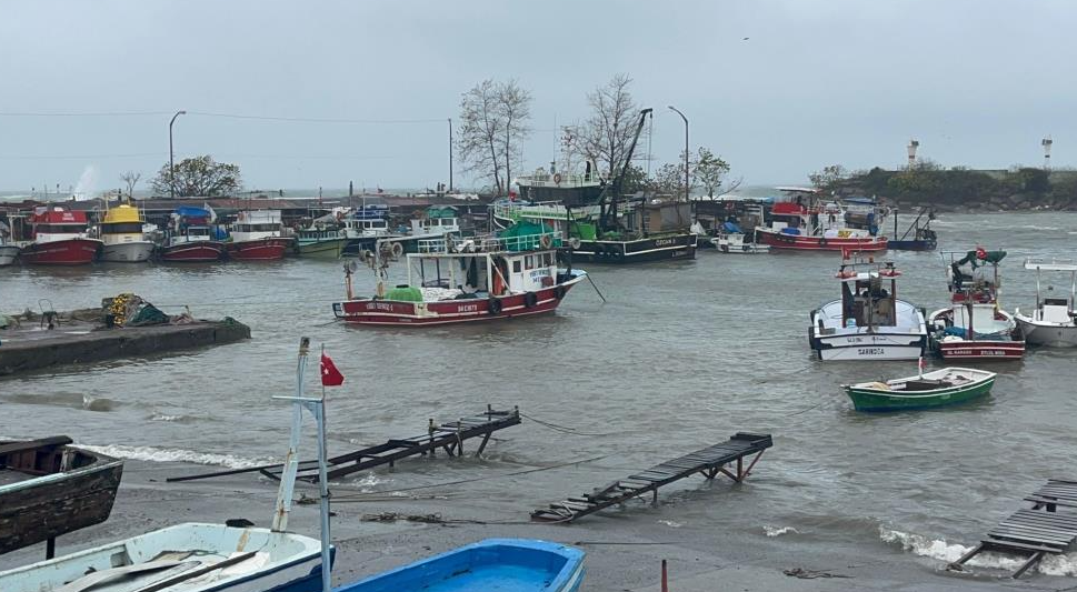 Olumsuz hava şartları sebebiyle denize açılamayan balıkçılar, teknelerini barınağa çekerek önlem aldı.