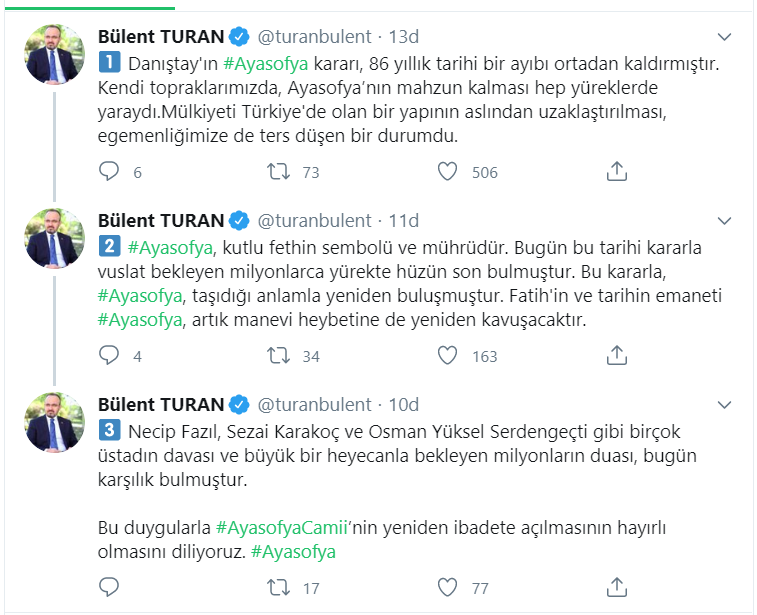 AK Parti Grup Başkanvekili, Çanakkale Milletvekili Bülent Turan, Danıştay'ın Ayasofya kararına ilişkin açıklama yaptı.