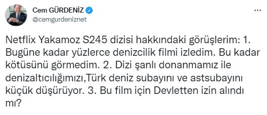 Darbe imalı bildiri yayınlayan 104 amiralin arasında bulunan emekli Tümamiral Cem Gürdeniz, başrollerinde Kıvanç Tatlıtuğ ve Özge Özpirinççi’nin yer aldığı Netflix yapımı Yakamoz S-245 dizisini eleştirip suçlamalarda bulundu.