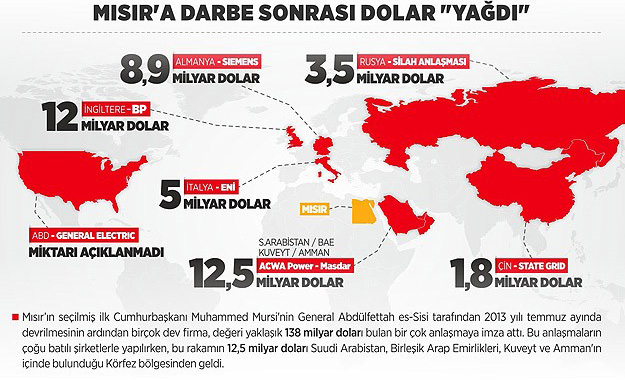 Mısır'ın seçilmiş ilk Cumhurbaşkanı Muhammed Mursi'nin Temmuz 2013'te darbeyle görevinden uzaklaştırılmasının ardından, "darbeye tepki" için gözlerin çevrildiği Batı ülkelerinden, beklenen tepkiler gelmezken, Mısır'a ekonomik anlamda destek yağdı.