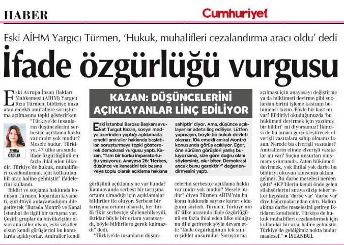Skandal bildiri yediden yetmişe herkesi ayağa kaldırırken, Cumhuriyet gazetesi yaptığı haberlerle yine kimseyi şaşırtmadı. Cumhuriyet, gece yarısı 104 amiralin imzasıyla, 'Aksi halde...' diye başlayarak darbeyi ima eden sözler bulunan bildiri 'Düşünce özgürlüğü' olarak yorumladı. Konuyla ilgili bugün birçok habere imza atan gazete, bu bildirinin düşünce özgürlüğü kapsamına girdiğini ve kişilerin kendi düşüncelerini söyleyebileceğini ifade etti.