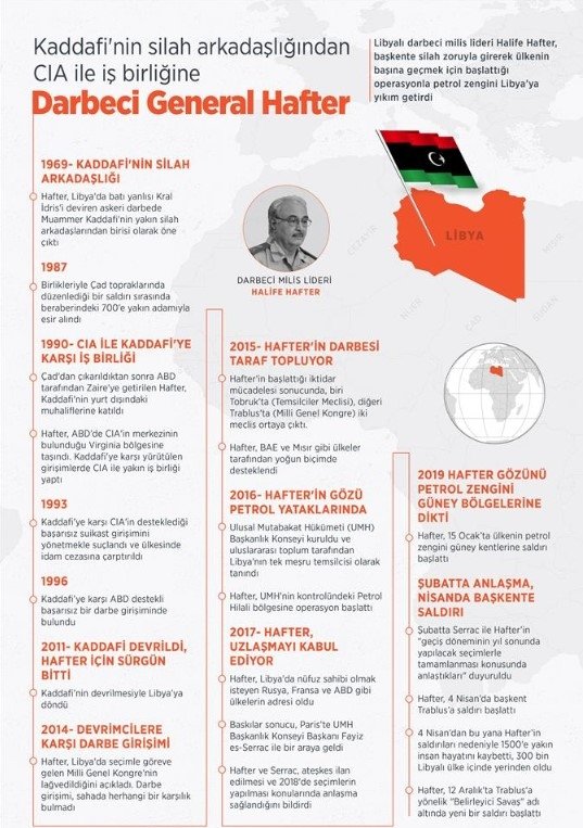 Libya'nın doğusundaki silahlı güçlerin lideri terörist Hafter, Muammer Kaddafi'nin silah arkadaşlığından ABD istihbarat örgütü CIA ile iş birliğine, Kaddafi'yi devirme çabasından onu devirenlere karşı darbeciliğe ve şimdi de başkent Trablus'u silah zoruyla ele geçirme girişimine uzanan "kariyeriyle", ülkesinin bugün içinde bulunduğu şiddet sarmalı ve siyasi kaosun önde gelen müsebbipleri arasında gösteriliyor.