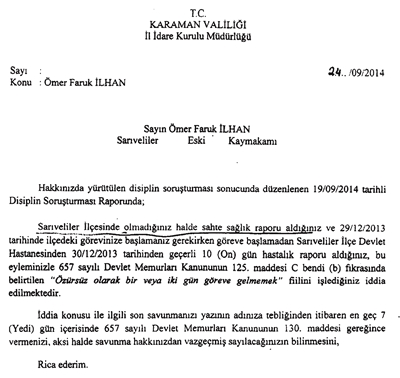 Ömer Faruk İlhan’ın şahsına ait raporun sahte olduğu ortaya çıkmasının ardından Karaman Valiliği İl İdare Kurulu Müdürlüğü, Sarıveliler Eski Kaymakamı İlhan hakkında disiplin soruşturması başlattı. 19 Eylül 2014 tarihli düzenlenen Disiplin Soruşturmasından İlhan’ın göreve başlaması gereken tarihte göreve başlamadığı ifade edildi.