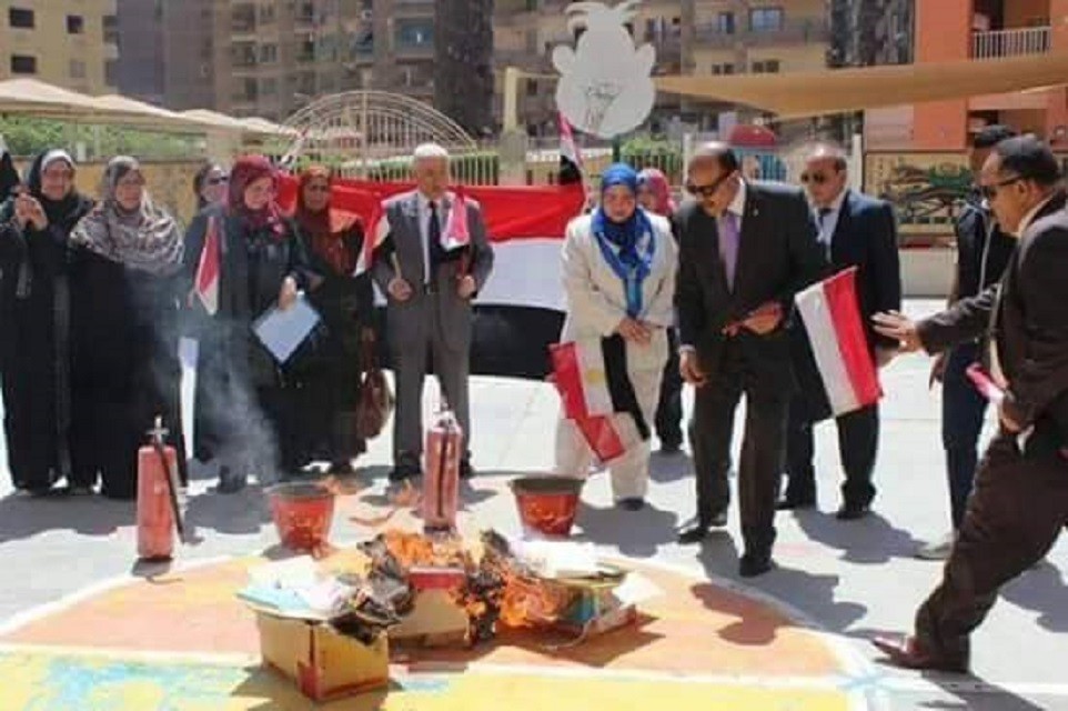 Kitapları yakanların içerisinde Mısır Eğitim Müdürlüğü Başkanı Buseyna Abdullah Kişk'da bulunuyor.