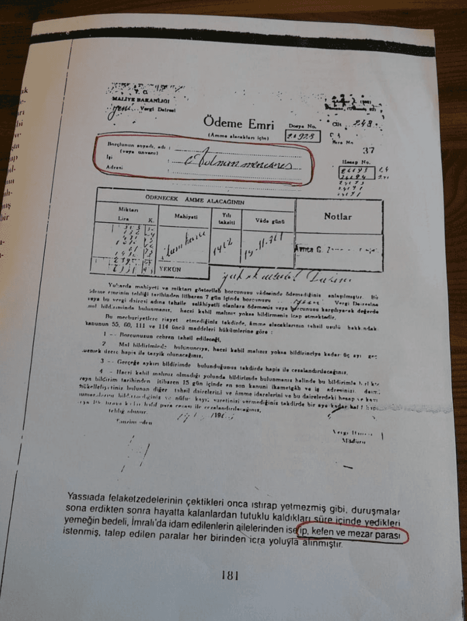 Yassıada yargılamalarından sonra Darbeciler idamlıklardan ip, kefen, mezar ve Yassıada’da yenilen yemeğin parası ödeme emri kâğıdı ile istemişlerdi.