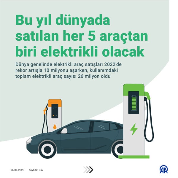 Elektrikli araç satış sayısının bu yıl dünya genelinde 2022'ye göre yüzde 35 artarak 14 milyona ulaşması ve satılan her 5 araçtan birinin elektrikli olması bekleniyor.