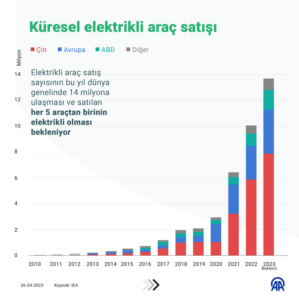 Bu sayının yıl sonu itibarıyla 14 milyona ulaşması bekleniyor, bu rakam 2022'ye oranla elektrikli araç satışlarında yüzde 35 büyüme anlamına geliyor.