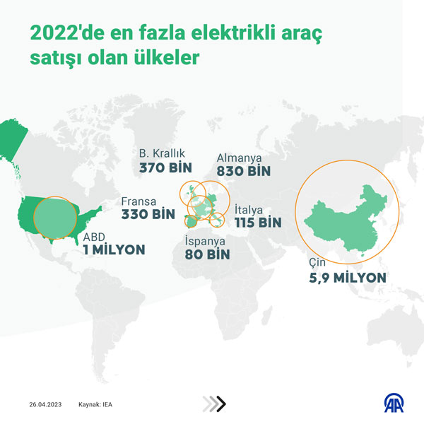 Çin, Avrupa ve ABD elektrikli araç satışlarının en yüksek olduğu pazarlar olarak öne çıkarken geçen yılki küresel elektrikli araç satışlarının yüzde 60'ı Çin'de yapıldı.