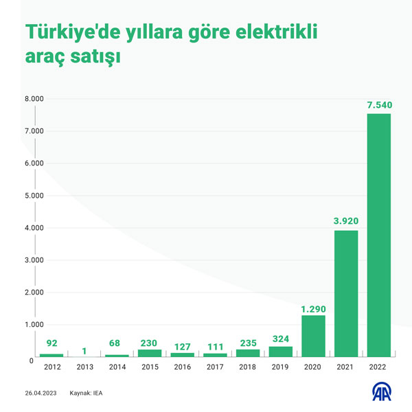 Türkiye'de geçen yıl toplam elektrikli araç satışları 2021'e göre yaklaşık iki katına çıkarak 7 bin 540 oldu, bu rakam 2021'de 3 bin 920 olmuştu.