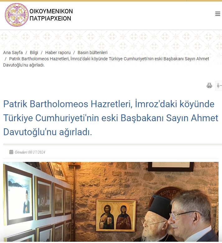 Ahmet Davutoğlu’nun Bartholomeos ile buluşması bir gün önce Patrikanenin yayın organında yer bulmuş ve haber “Patrik Bartholomeos Hazretleri, İmroz'daki köyünde Türkiye Cumhuriyeti'nin eski Başbakanı Sayın Ahmet Davutoğlu'nu ağırladı.” Şeklinde verilmişti. Davutoğlu ile Patrik’in ne amaç ile bir araya geldiklerine değinmeyen gazete Davutoğlu’nun buluşmada İstanbul Rum Patrikhanesi olarak 2012 yılında İstanbul Rum Patrikhanesi'ni, 2013 yılında ise Atina İmrozlular Derneği'ni ziyaret ettiği günleri hatırladığını yazdı.