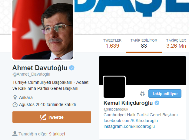 Davutoğlu'nun Twitter'da takip ettiği kişi listesinde Kılıçdaroğlu dahil 83 kişi yer alırken, takipçi sayısı ise 3 milyon 250 bini aşmış görünüyor.