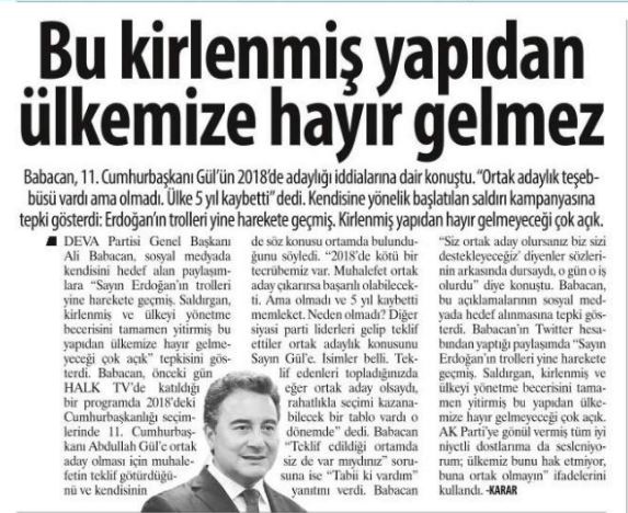 Babacan’ın Halk TV’deki programı ile ilgili haberde iktidarı eleştirdiği ‘kirli siyaset’ sözlerine yer veren Karar, AK Parti içerisindeyken hainlik yapıp, Erdoğan aleyhine çalıştığı yönündeki itirafını ise görmezden geldi. "Bu kirlenmiş yapıdan ülkemize hayır gelmez" başlığını atan Karar’ın bu ikiyüzlü tavrı asıl gayenin gazetecilik değil siyasi borazanlık yapmak olduğunu gözler önüne serdi.