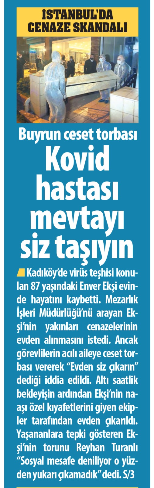 Basına yansıyan haberlerde İBB Mezarlıklar Müdürlüğü ekiplerinin, yaşlı adamın yakınlarına ceset torbası vererek cenazeyi evden çıkarmaları istediği bilgisine yer verilmişti.