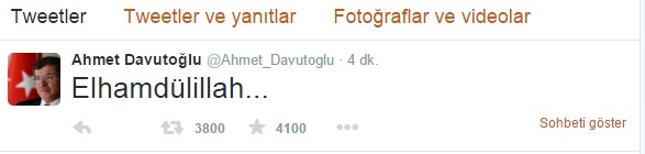 Başbakan Davutoğlu attığı tweetle 'ELHAMDÜLİLLAH' yazarak ilk yorumunu yaptı.