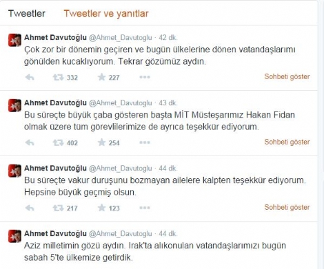 Başbakan Ahmet Davutoğlu, IŞİD'in elinde alıkonulan Türk vatandaşlarının Türkiye'ye getirilmesini twitter adresinden duyurdu. Davutoğlu özellikle Hakan Fidan'a teşekkür etti.