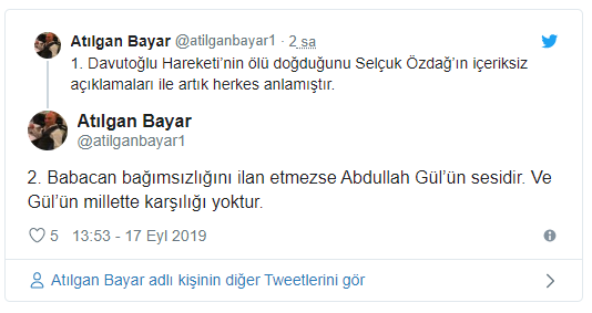 Paylaşımlarında Davutoğlu ve Babacan’ın eleştiren Bayar ''Babacan bağımsızlığını ilan etmezse Abdullah Gül’ün sesidir. Ve Gül’ün millette karşılığı yoktur’’ dedi. Bayar, Davutoğlu’nun partisinin ise ölü doğduğunu belirterek şu Tweetleri attı.