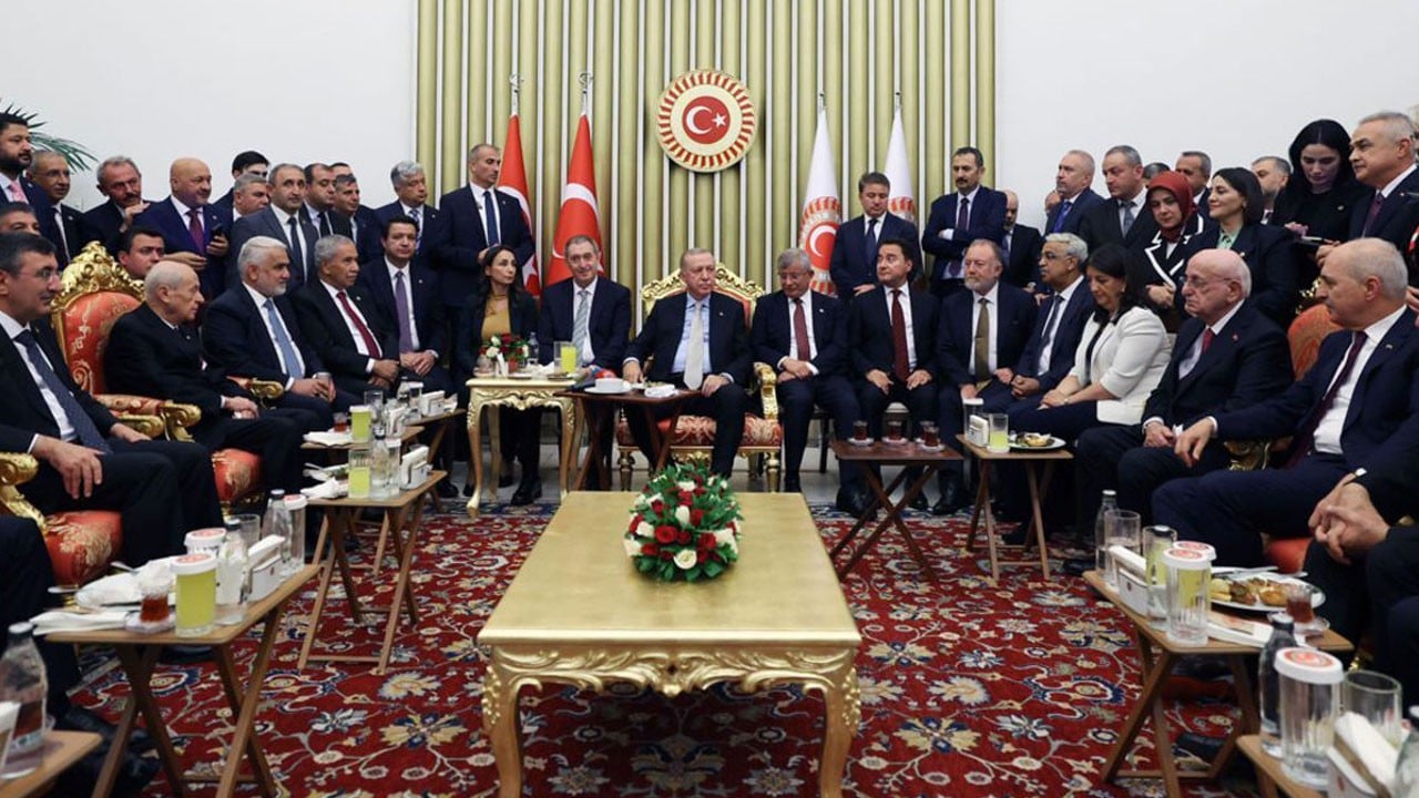 TBMM Tören Salonu'ndaki resepsiyona, Cumhurbaşkanı Erdoğan’ın yanı sıra MHP Genel Başkanı Devlet Bahçeli, DEM Parti Eş Genel başkanları Tuncer Bakırhan ve Tülay Hatimoğulları, Gelecek Partisi Genel Başkanı Ahmet Davutoğlu, DEVA Partisi Genel Başkanı Ali Babacan, Saadet Partisi Genel Başkanı Mahmut Arıkan, Yeniden Refah Partisi Genel Başkanı Fatih Erbakan, HÜDA PAR Genel Başkanı Zekeriya Yapıcıoğlu, BBP Genel Başkanı Mustafa Destici ve bakanlar ile milletvekilleri katılmıştı.