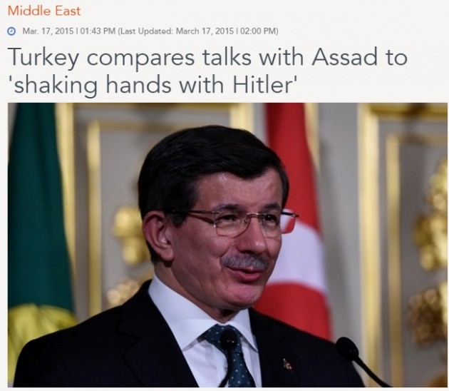 Başbakan'ın sözlerini ilk sıradan gören Suudi El Arabiya, haberi 'Davutoğlu: Esed'le görüşmek Hitler'le tokalaşmak gibidir' başlığıyla verdi. Haberde Davutoğlu'nun ABD Dışişleri Bakanı'nın sözlerine sert bir cevap verdiği anlatıldı.