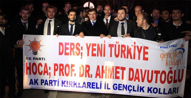 Pankartta ''Ders Yeni Türkiye, Hoca Ahmet Davutoğlu'' yazısının arkasına Başbakanı da alarak fotoğraf çektirenpartililer başbakanı Kırklareli’den Çorlu'ya uğurladı.