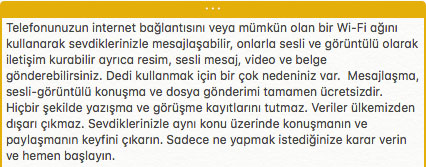 Uygulamayı ilk kez kurduğunuzda karşınıza çıkan ekrana telefon numaranızı girerek kaydolabilirsiniz. Dedi, arama ve mesajlaşmalarınızı hiçbir şekilde saklamaz ve işlemez. Kayıtlar sunucularda sadece transfer amaçlı anlık olarak tutulur. Böylece transfer tamamlandığında kayıtlar silinmiş olur. Dedi, güvenli mesajlaşma konusunda endüstri standartlarını belirleyen Signal uygulaması üzerine geliştirilmiştir. Kaynakları açıktır, herkes tarafından incelenebilir. Sohbet Grubu Kurulabilir Mi ?Grup sohbetleri ile aileniz ve arkadaşlarınızla sürekli iletişim halinde olabilirsiniz.