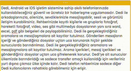 Dedi ile sohbetleriniz uçtan uca şifrelenir ve veriler hiçbir yerde barındırılmaz. Dedi uygulaması, Google Play ve Apple Store uygulama marketlerinden indirilebiliyor. Android ve iOS işletim sistemine sahip akıllı telefonlardan indirilebilen uygulama, güvenli ve ücretsizdir. Görüntülü ve sesli arama.Konum, ses, video ve belge gönderimi.Grup sohbeti imkanı.Tüm mesajlar uçtan uca şifrelenerek saklanmaktadır.Silinen mesajlara belli bir süre erişme imkanı.