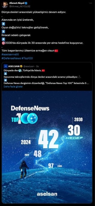ASELSAN Genel Müdürü Ahmet Akyol, konuya ilişkin sosyal medya hesabından açıklamada bulundu. Dünya savunma sanayii devleri arasında yükselişlerinin devam ettiğini söyleyen Akyol, “Alanında en iyisi üreterek, oyun değiştirici teknojiler geliştirerek, ihracat odaklı çalışarak, 2030'da dünyada ilk 30 arasında yer alma hedefine koşuyoruz. Tüm başarılarımız ülkemize armağan olsun” dedi.