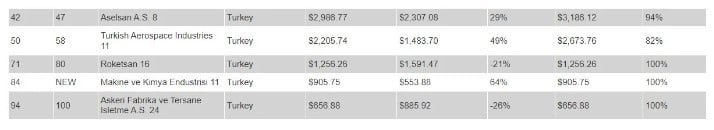 Liste verilerine göre; ASELSAN 47. sıradan 42. sıraya, TUSAŞ 58. sıradan 50. sıraya, Roketsan 80. sıradan 71. sıraya, ASFAT ise 100. sıradan 94. sıraya yükseldi.