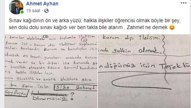 Ayhan, yazılı sınav kâğıdının birinci sayfasını tamamlayıp sayfa sonuna, “Hocam bu soru için size zahmet arka sayfaya döner misiniz? Döndüğünüz için teşekkürler” yazan öğrencisinin kâğıdını resmi Facebook hesabından, “Sınav kâğıdının ön ve arka yüzü; halkla ilişkiler öğrencisi olmak böyle bir şey, sen dolu dolu sınav kâğıdı ver ben takla bile atarım. Zahmet ne demek” yorumuyla paylaştı.