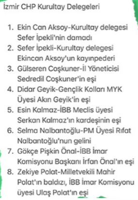 Büyük kurultayda CHP Genel Başkanı'nı seçmek üzere oy kullanacak İzmir delegelerinin çoğu, yine başka bir CHP'linin akrabası olması sayesinde bu unvanı elde etmiş oldu.