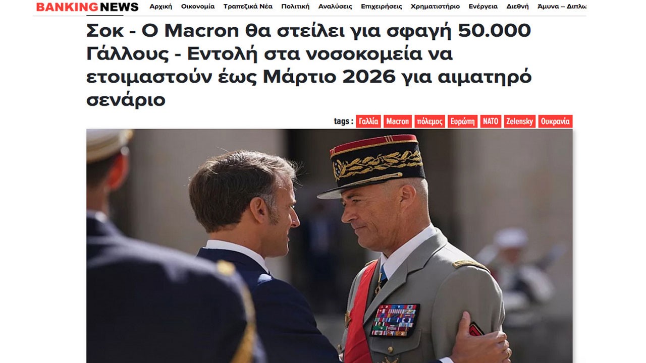 Yunan sitesinin haber analizinde Macron’un bir savaşa hazırlandığı ifade edilerek , “Şok - Macron 50.000 Fransız’ı katliama gönderecek - Hastanelere Mart 2026’ya kadar kanlı bir senaryoya hazırlanmaları emredildi” manşeti kullanıldı.